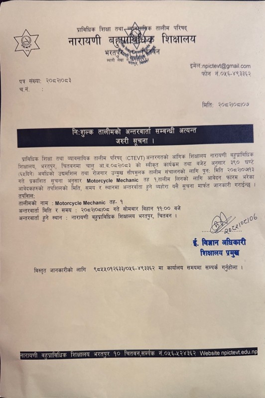 मोटरसाइकल मेकानिक्स तालिमको अन्तर्वार्ता सम्बन्धि सुचना